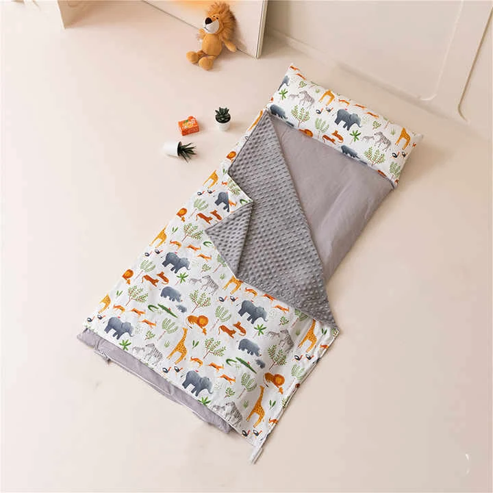 Blauwe Toddler Camping Nap Bag It Rollup-ûntwerp lit de mat om mei gemak te reizgjen, lykas ek de maklike befestigjende riemingen en it dragende handgreep.