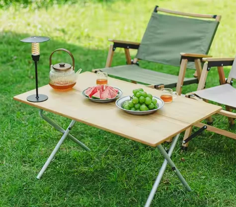 FOLDAID DRAPTE BAMBOE EN ALUMINIED TABLE, DAT IS STURTY, STOVY, EN MILJOCHTFRIEND. En effektyf waterdicht. De glêde tafelblêd is perfekt foar it pleatsen fan drankjes, snacks of kokenapparatuer oan.