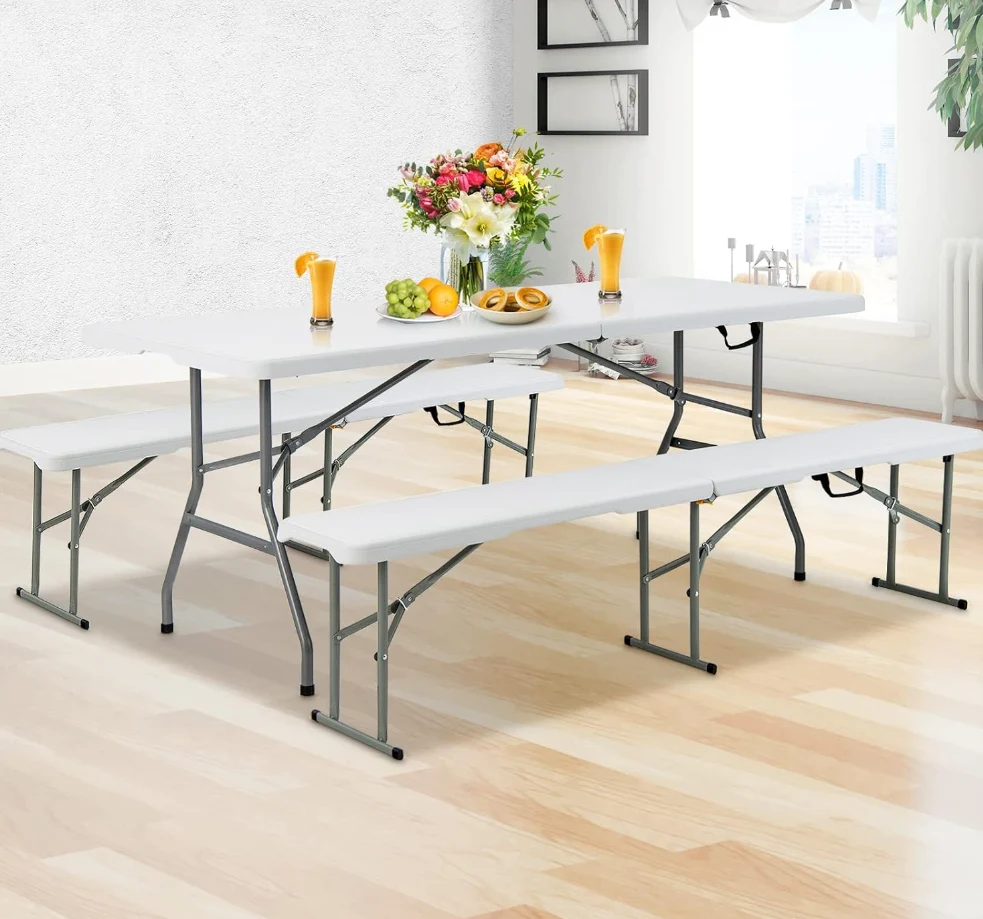 Hege kwaliteit Camping-tafel, wite HDP-wyt rjochthoekige Picknic-tabel Plastic Plastic Folding Outdoor Camping-tabel, foarsjoen fan iten, desserts, drinken, of snacks. Dizze klaptafel kin plak foldwaan om sawat 8 minsken om te sammeljen foar in famyljele miel as feestdiner. En alle hoeken fan 'e tabel binne rûnom om tafallich blessuere te foarkommen.