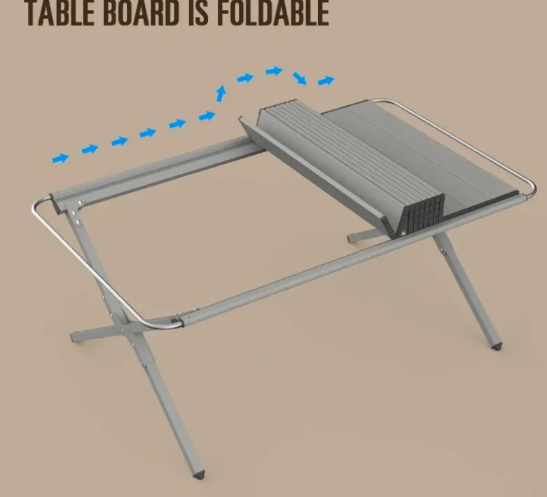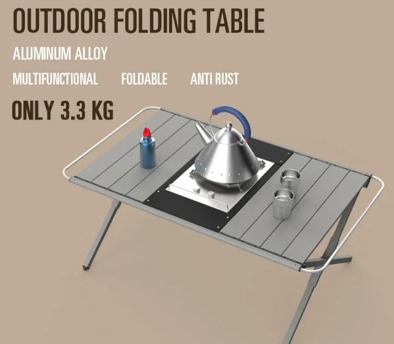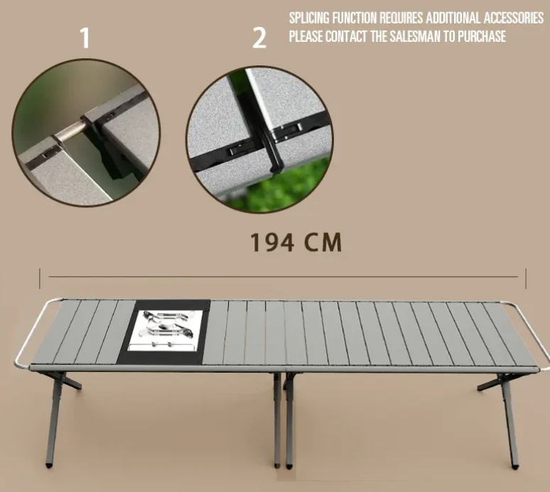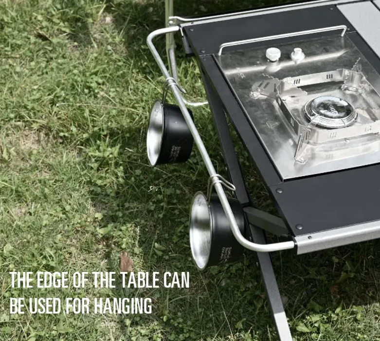 Ljochtgewicht multyfunksje dy't opklapte as it is-tabel, neffens jo behoeften. Perfekt foar camping, barbecues, bûtenkooking, en mear. De kant fan 'e tafel kin brûkt wurde om gerjochten te hingjen en utensils