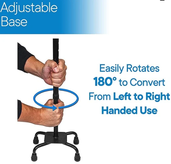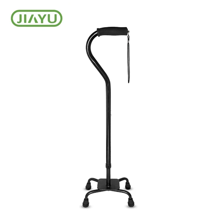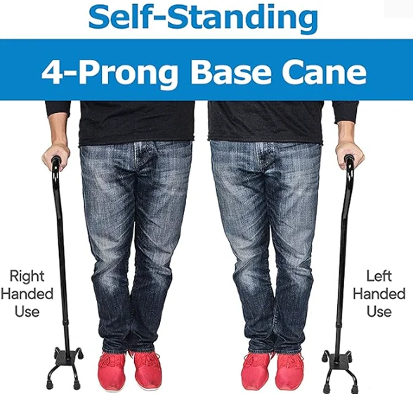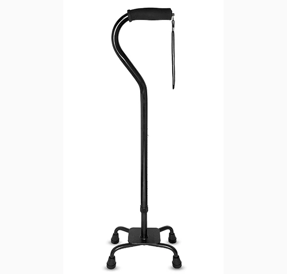 Alde man medyske cane, elke prong is bedekt mei in anty slip rubber cane tip foar ekstra stabiliteit en feiligens. De quad-basis makket it in sels steande cane dy't elimineart of op 'e flier falle of sakje. Perfekt foar nei de operaasje as jo net kinne bûge of berikke.