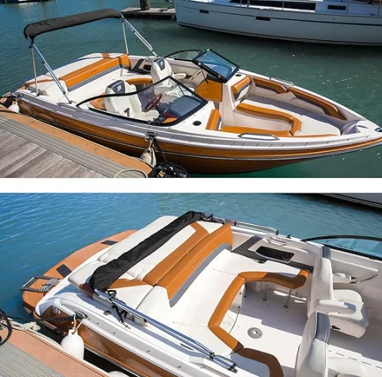 Stainlse boat Bimini-top, makke fan marine klasse 600D polyester-doek mei dûbele pu coating, ús opslachloot leveret goede beskerming tsjin sinneljocht, seewetter, rein en stof.